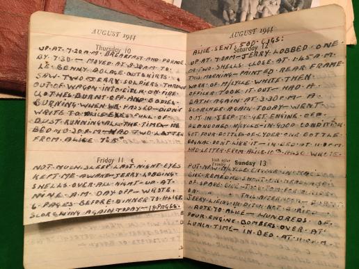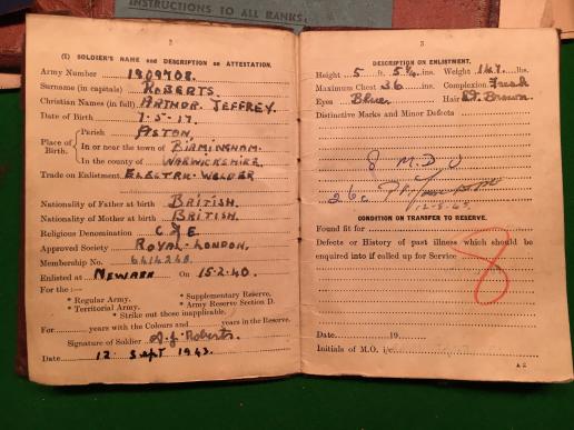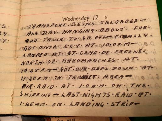 Ephemera grouping to 1809708 Pte.Arthur J.Roberts RE. Clearly a veteran of the Desert campaign ( Africa Star 8th Army clasp endorsement to paybook ) with numerous copies the 8th Army newspaper ' Crusader ' and various photographs, CMF passes etc.Wallet containing more photographs, military and personal with a printed Canadian artillery divisional sign ( briefly attached to CRE GHQ )a collection of banknotes, Italian, French and German and paybook. However, the nicest item is a pocket diary that is filled in from his landing at ' St.Come de Fresne ' on July 12th 1944 through Normandy and France, Belgium and Holland. Daily entries often very detailed mentioning burning German corpses, air raids, RAF and US bombing, RAF ALGs, Russian Generals, seeing Monty, ' Jerry making a fight of it, lobbing shells over ' etc. Also covers the more mundane, letters written and received, sleep, rations and the acquisition of cider and Calvados and a dislike of the latter. Very interesting and worthy of further research with a large number of place names mentioned throughout. It would appear three entries having been deliberately removed for reasons unknown. All items in good, used condition with some wear, minor tears etc.