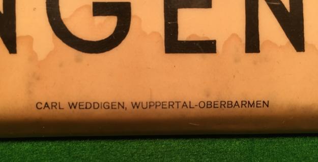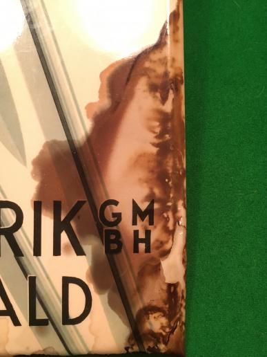 Celluloid and tin sign measuring 32cns x 480cms and features two swords and one bayonet behind the silver WKC knight head logo on a blue background. The sign is in excellent condition with the exception of the lower edge and one corner that has clearly suffered from water damage causing staining see images. Priced to accommodate these failings.