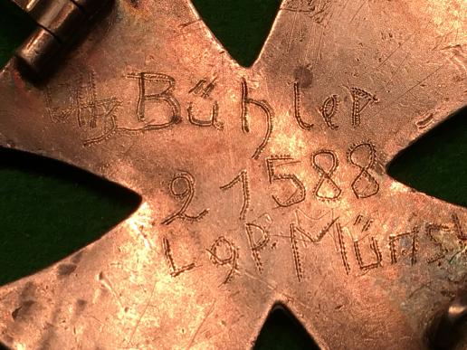 Not one for the condition junkies this EKI has had a hard life, it's saving grace is the hand engraved details to the reverse. The cross is an Otto Schickle product with it's characteristic pin with the mark L/15, it has a slight curvature with a rubbed and lightly toned frame. The core has very little enamelling remaining with some scratching. The reverse is marked and both the pin are distorted but intact. Hand engraved to the reverse are the owner's details ' Uffz.Buhler 21588 L9P Munster '. Attached is a list of units that had a connection with the Feldpost number 21588..