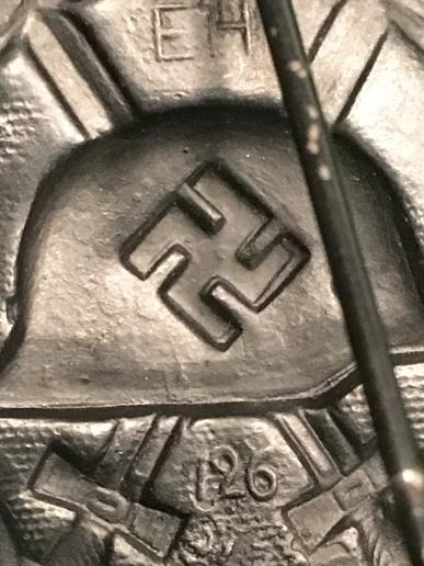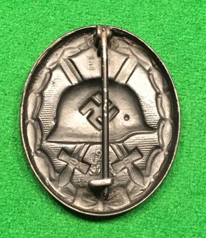 Die stamped steel Black Wound Badge with stout needle pin to reverse. Double manufacturer marked ' 126 ' and ' EH ' for Eduard Hahn, Oberstein. Solid blackened finish with some minor abrasions, excellent condition.