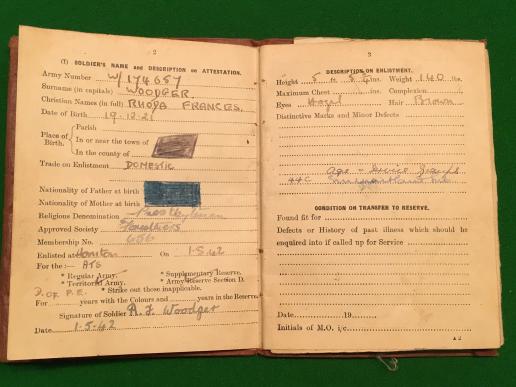 Small grouping of items from a member of the A.T.S. W/174657 Pte.Rhoda, Frances Woodger. Comprising a paybook revealing that Woodger enlisted at Honition in 1942, along with her capbadge, dogtags, brass shoulder titles and lanyard. All items in good, used condition.
