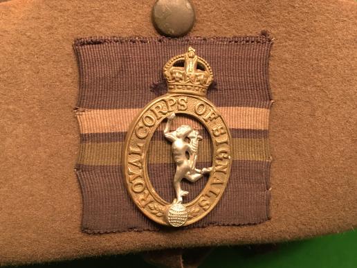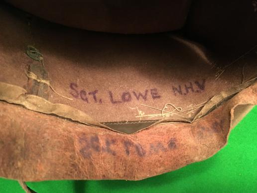 British, WW2 felt bush hat for a member of the Royal Signals. Approx. size 7 with maker's details, sizing etc now obscured through wear, named to the inside to a Sgt. N.H.V.Lowe. Royal Corps of Signals badge to turn up backed by Signal's backing. Good overall condition with some minor areas of light mothing, chinstrap present but needing repair.