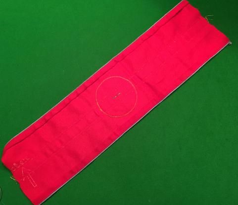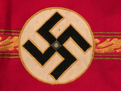 NSDAP Ortsgruppenleiter armband constructed of fine red wool with black ribbed swastika with a single gilded pip in the center, superimposed on a white circle, both edged in golden cotton threads. Extending to both sides of swastika are large oakleaves in golden celleon, edged by a double row of twisted bullion wire. Armband is approximately 13cm tall, edged on top and bottom with a single bullion row and with blue cord, colours remain bright, showing no wear, in overall extremely fine condition. To the reverse a printed arrow and the word ' Oben ' ( Top ) indicating position of wear. Excellent example of the highest leader at the Orts level.