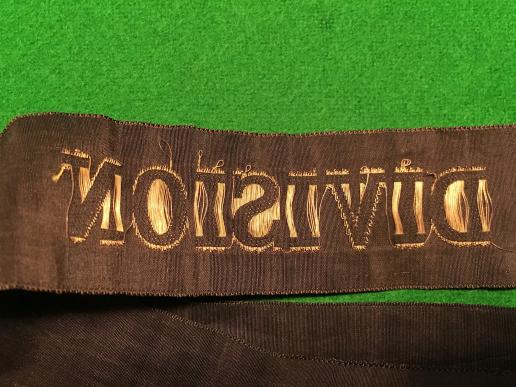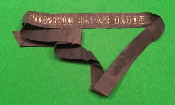 Scarce WW I, bullion wire sailor's cap tally, "Royal Naval Division". Worn on sailor's caps with khaki uniform in the early days of WW1 . Full length ( 106cms approx. ), good, used condition with some creases.