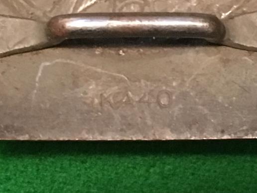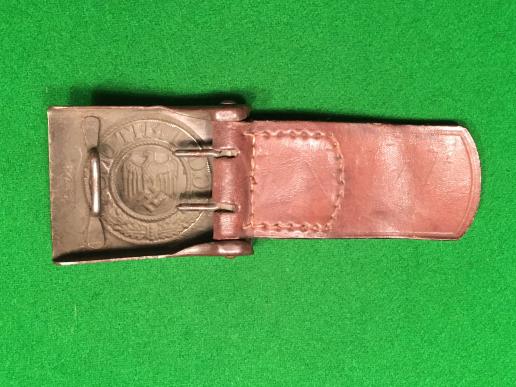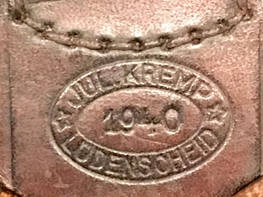 One piece steel belt buckle for use by the Wehrmacht Heer. Maker marked ( I/H?KA40 ) with attached leather tab with the makers ' Jul.Kremp, Ludenscheid ' and date 1940 impressed. Has approx 85% original green finish overall with the usual wear to high points. Good example.