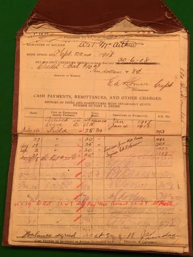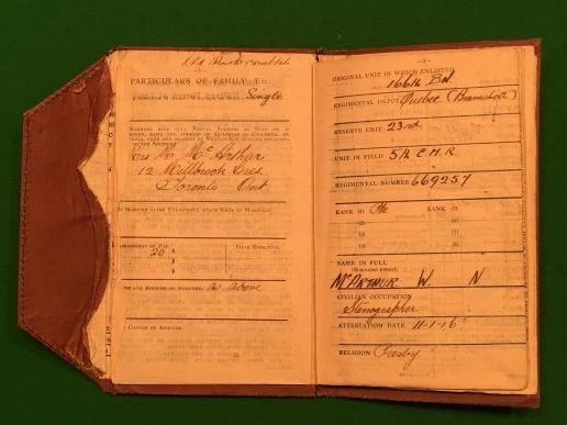 WW1 Canadian active service pay book to 669257 Pte. W.N.McArthur of the 5th Battalion Canadian Mounted Rifles. McArthur from Toronto joined in 1916 and arrived in France in Jan.1917. The 5th CMR fought at Vimy and in and around Ypres during 1917. In good overall condition, although contents bound upside down. Further research required.