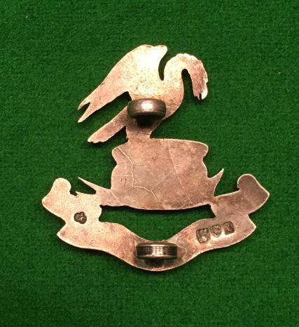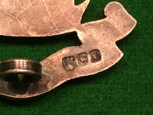 Silver cap badge with 2 loops to reverse. Hallmarked 1914 London and maker marked for Elkingtons. Issued by Lord Derby to any man who enlisted before 16th October 1914 in the Pals Battalions of the King's ( Liverpool Regt.) Badge is the crest of Lord Derby. Ref K&K Vol1 1146.