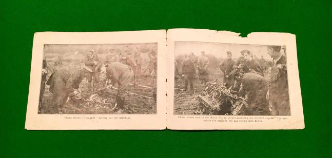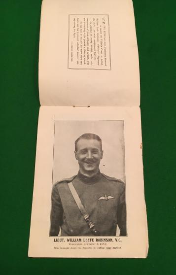 13pg souvenir booklet containing a brief account of Leefe Robinson's exploit in shooting down the first Zeppelin and numerous photographs of the event and the resultant wreckage. Good, used condition with marking to covers, slight rips and damage.
