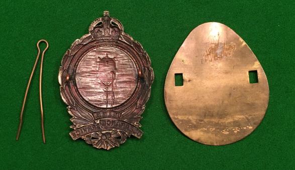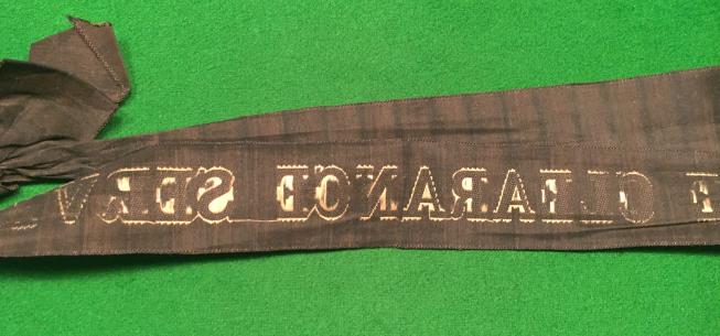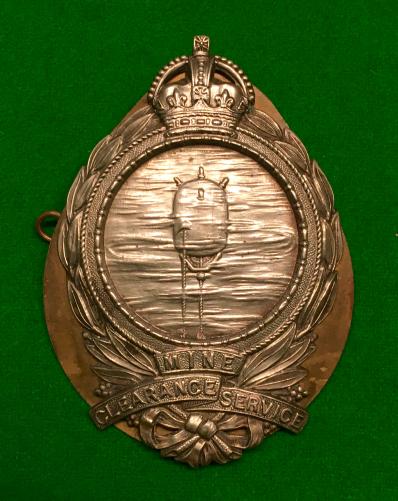 Immediately after the First World War, the Mine Clearance Service was established to sweep the large numbers of mines laid during conflict. This service was abolished in 1920. These two items, a die-struck, white metal arm badge, and a cap tally are from this brief incarnation of the service. Arm badge retains it's shaped backing plate and the scarce naval tally is in tied condition. Both items in good condition with light overall fading and minor damage to the ribbon.