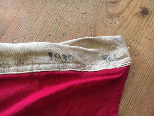 German Third Reich Reichskriegsflag or Kriegsmarine battle flag. 65cm x 50cm size with size designation, Kriegsmarine proof stamp and ' Hamburg ' to hem. Halyard loop and line have been carefully removed and in good bright condition with some minor staining to one corner but otherwise undamaged. Very presentable example in a manageable size.