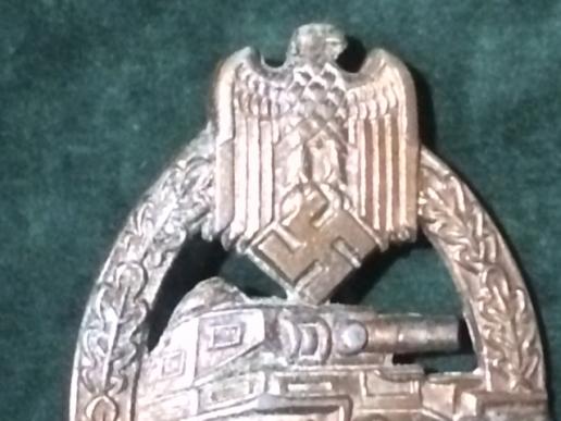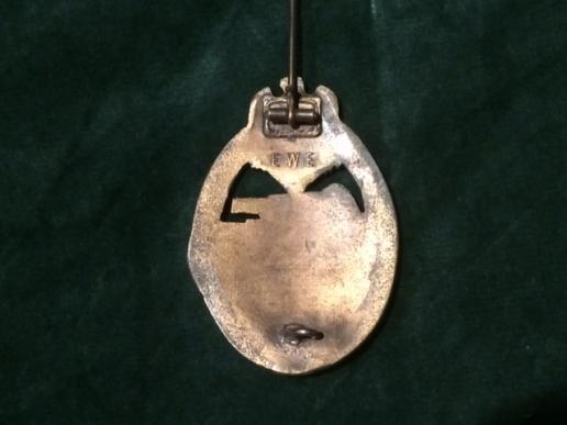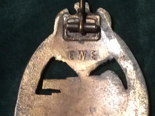 A really nice Tank Assault badge or 'Panzerkampf Abzeichen' in bronze. Nearly ALL of the bronze finish remains to the front, around 85-90%, and 100% remains to the reverse. It is made by the very rare maker EWE. Apparently EWE were a small Austrian firm and seemed to ONLY make silver and bronze Panzer badges, as their maker mark has not been seen on any other WW2 German badges. Pin and hook are in great condition and the detail/casting is extremely crisp. If you collect by maker, perhaps this is one you don't have.