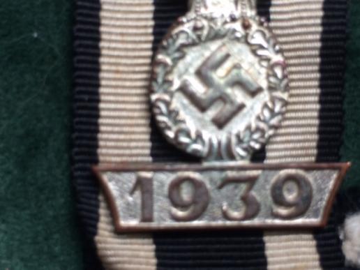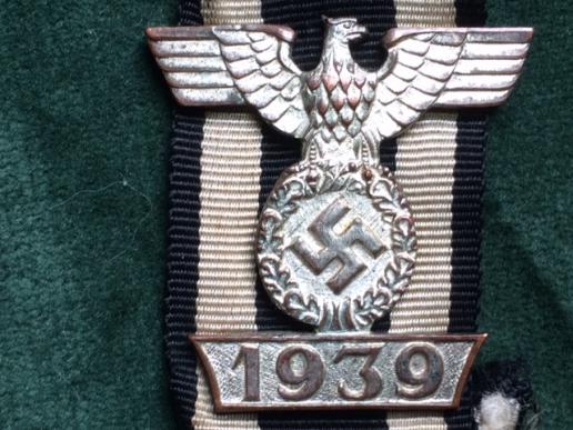 This is a nice , early version of the bar to the Iron Cross 2nd class. Awarded in the Third Reich period to those already awarded an Iron Cross in WW1, but awarded it again in WW2. An early version with shorter wings and 4 pins to the reverse. Is mounted on an original piece of the slightly thinner 'dress' iron cross ribbon. In very good condition, still has 85% of the original silver frosting over the silver plate. Some patina to the reverse. Nice award.