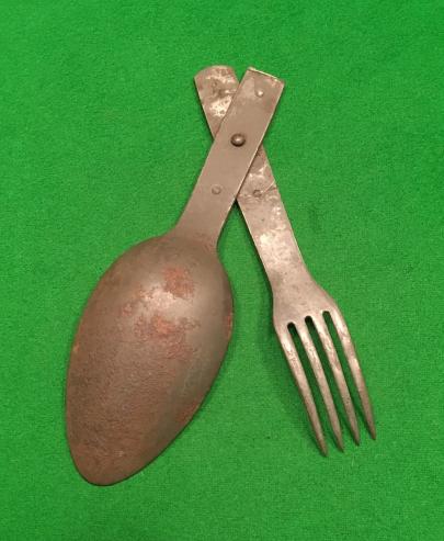 WW1 Imperial Fork/Spoon combination set. Coated steel spoon and fork combination hinged by a rivet to enable closing. Still retaining a large amount of it's original field grau finish with some corrosion to reverse of spoon bowl.