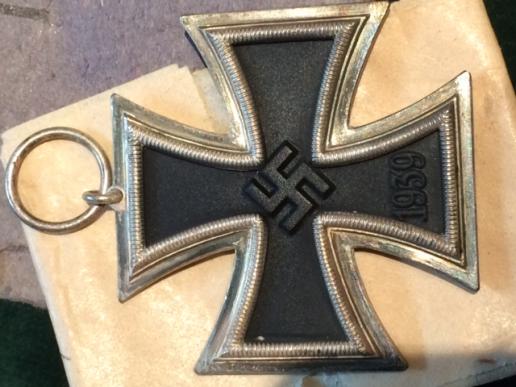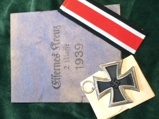 This is a beautiful medal and has been protected by being inside the original issue paper packet! It's complete with the original length of folded EKII ribbon. Iron cross itself is in mint condition with all the original frosting over the silver edges.Medal is even still in the cream tissue paper from the factory. Black paint in centre is perfect, unissued! The cross suspension ring is stamped with a '1'. Maker is Deschler & Sohn.' The original buff coloured paper packet is in mint condition just a little faded from age, with the reverse being stamped in ink with maker Deschler & Sohn . A great medal in the packet it came in.