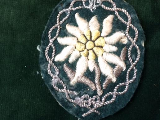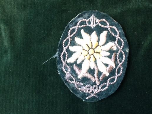 A nice , high quality embroidered sleeve badge with cloth and bullion thread highlights, so probably for an Officer. Flower in yellow, embroidered onto green backing. Surrounding intertwined 'rope' thread in bullion. Remains of backing material on reverse . Been on a tunic. Worn by all 'Jager' mountain troops on their right sleeve.