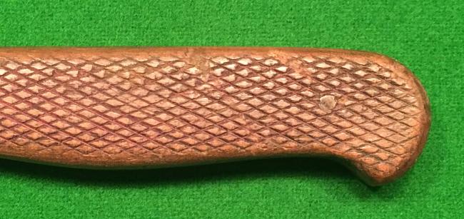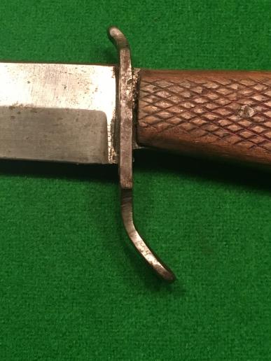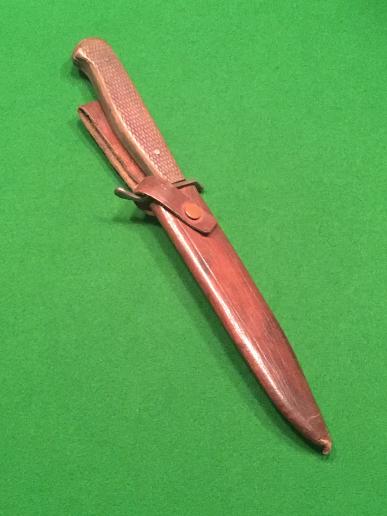 WW1 Imperial, probably private purchase fighting knife. 15cm blade with a double false edge and a swept cross guard. Softwood grips with applied hand chequering contained in all leather scabbard with integral belt loop. Good, used condition.