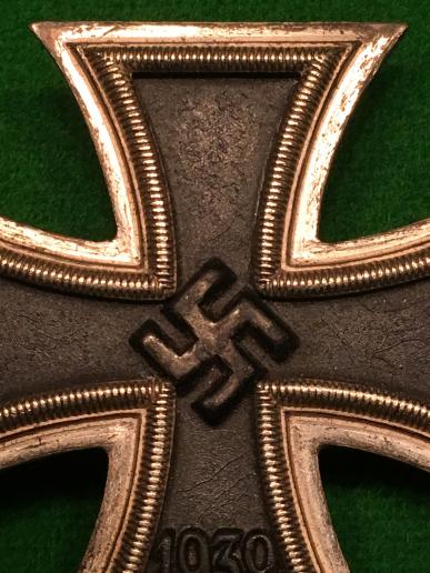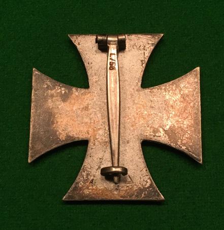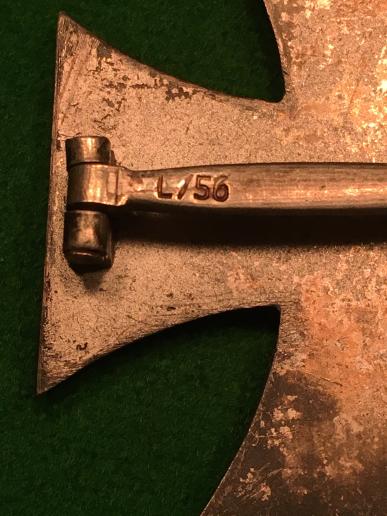WW2 pinback EKI, LDO marked ' L/56 ' for the maker Funcke & Bruninghaus. Steel core with silvered frame and block and barrel hinge and flat wire catch with tapered pin with LDO number stamped to the outside face. Patinated finish to silvered parts with rubbing of finish to highpoints of the core. Good, overall condition.