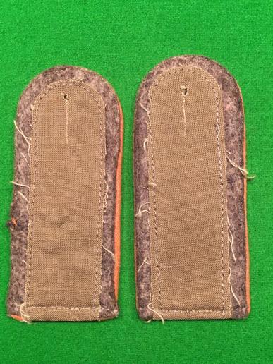 A pair of late War shoulder boards for an O/R of the Luftwaffe signals branch. Recovered grey wool body with brown cotton waffenfarbe and a feld grau cotton retaining strip, typical of later War construction. Unissued matching pair.