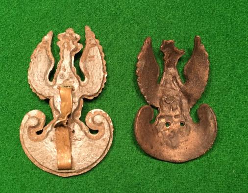 Acquired from the same estate in Bedfordshire these two badges are typical of those worn by O/Rs serving with the Polish Army in the UK during WW2. The first is an issue plastic ( cellulose acetate ) Polish Army eagle cap badge by A.Stanley of Walsall, just as typically this has deformed through heat but is intact and possesses both blades to the reverse. The second is a cast brass Army eagle surmounting a shield typical of those at unit level again typically curved backwards to fit around the seam of the field service cap. It was retained via two holes through which it would be stitched to a cap, good condition with polished highlights.