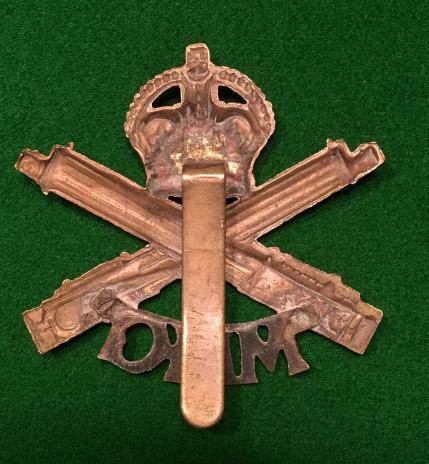 Bi-metal cap badge with slide to reverse. Brass crossed machine guns and crown with white metal MMG soldered beneath. Good, used condition.