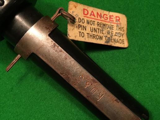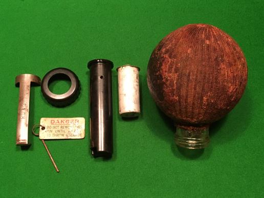 British No.74 MkI Anti-Tank Grenade ' Sticky Bomb '. Featuring a glass globe ( that would originally been filled with nitro ) covered with stockinette impregnated with adhesive. A bakelite handle contained the fuze and igniter retained by a steel handle and pin with attendant label warning thrower not to remove pin before throwing. The globes were originally covered by two hinged sheet metal hemispheres to protect the thrower from the adhesive and were then removed before throwing, they are unfortunately, no longer present. Adhesive stockinette has now dried out, safety lever manufacturer marked with igniter pocket present. Good, overall condition, strippable. Scarce.