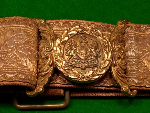 Pre WW1 Officer's brocade sword belt. Calf lined quality brocade belt featuring a two piece gilt buckle. Although there are no obvious maker or retailer details it is typical of the quality accoutrements worn by officers of the period.