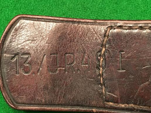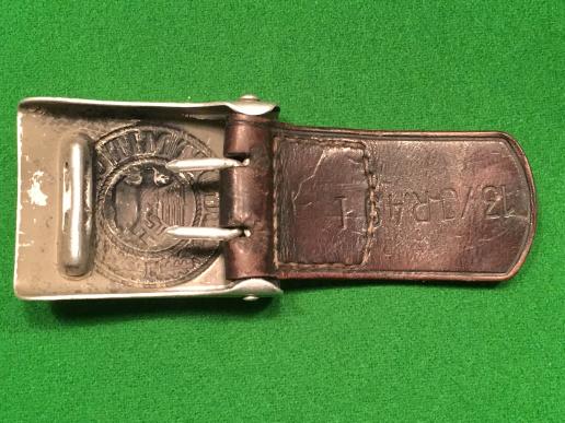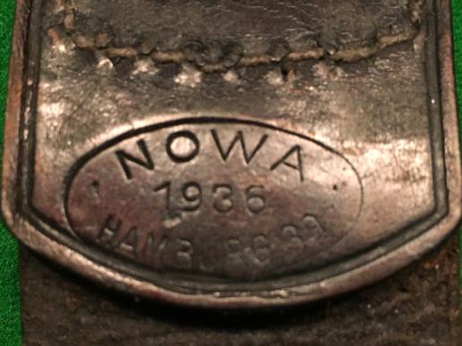 One piece aluminium Wehrmacht buckle with manufacturer marked and dated leather tab. Although buckle is not manufacturer marked it bears the hallmarks of a Franke & Co product. Tab is marked ' Nowa, Hamburg 1936 ' and retains it's paint finish to reverse. Tab also bears the unit marking ' 13./J R.49 I ' Good overall condition with light wear to highlights.
