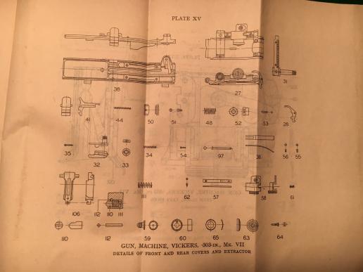 Scarce Machine Gun Handbook ( Technical ) Vol I, Pamphlet No.1 - Vickers .303in. and .5in. Machine Guns and Appurtenances 1940.117pgs with 36 fold out plates. Highly detailed manual covering the technical aspects of the main medium and heavy machine guns used by the British Army. Detailed plans, photographs and diagrams of all technical aspects of the guns and their associated equipment. Good, used condition with marking to covers but clean contents.