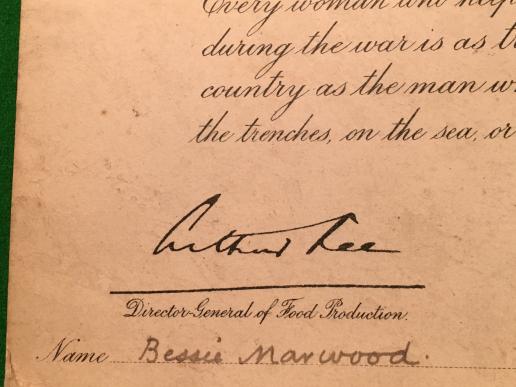 Service certificate presented by the Board of Agriculture marking the service of a Bessie Marwood in the Land Army during WW1. Printed onto card, the certificate has some marking but is in generally good condition.