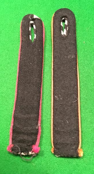 Two examples of shoulder boards worn by an NSKK Mann up to the rank of Obertruppfuhrer on the right shoulder only. Both boards feature aluminium and cotton checkerboard with coloured piping indicating unit. One board was worn by a member of either Moto-Brigade Westfalen or the Motor-Gruppe Ostland ( Dark Wine Red ) and the other by Motor-Brigade Sudwest or Mitte ( Orange Yellow ). Both in good used condition with slight damage to the tip of one board.