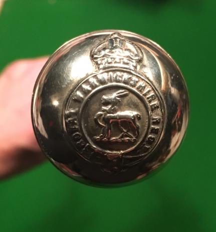 Lovely, clean example of a regimental swagger stick featuring the badge of the Royal Warwickshire Regt to the ball. Both ball and tip are of highly polished silver plate mounted onto a cane that features a french polish type finish. Exceptionally clean example with light rubbing to highpoints of regimental badge.