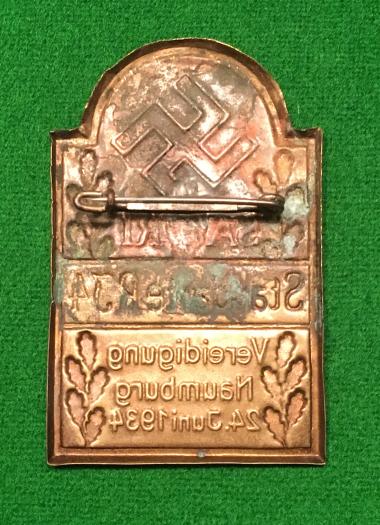 Large 60mm x 38mm pinback tinny badge celebrating the swearing in ceremony of SA Standard RJ4 in Naumburg on 24.06.1934. Sheet brass construction with antiqued bronze finish, some very light marking otherwise good, clean condition.