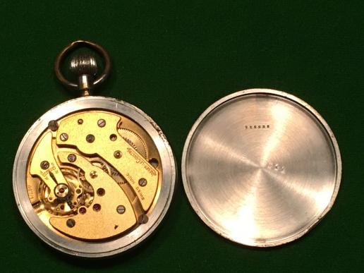 A working example of a pocket watch with a movement of the highest possible grade being used to fulfil a specific military requirement, this ' General Service Trade Pattern ' by Jaeger-Le-Coultre fulfils this criteria. Nickelled brass case marked to reverse ' GS/TP F004557 Broad Arrow, with white dial retaining it's luminous indications to 3, 6, 9 and 12 and both hands. Case contains a fifteen jewelled calibre 467/2 movement which was entirely produced in-house by Jaeger Le Coultre in Le Sentier. Introduced in 1943 the movement carries the signature “Jaeger LeCoultre, Swiss Made” on the bridge, with the calibre number stamped next to the balance wheel, it appears to be running perfectly. Rubbing and light marking to case and flaking to dial , which appears to be stable, this is a genuine example, priced to reflect the damage.