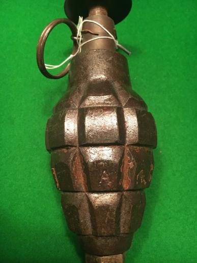 Also known as the ' Trench Warfare Dept. Percussion Pattern, the No.19 MkI Hand Grenade was introduced in 1916 and was finally made obsolete in 1920. This example retains traces of it's original paint and is clearly manufacturer marked ' A ' to the body of the grenade .