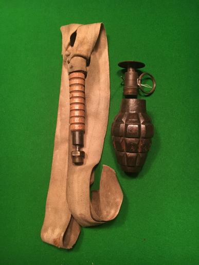 Original wooden handle and original cloth tapes. An excellent example of a scarce grenade. Fully strippable.