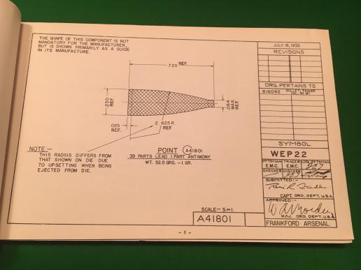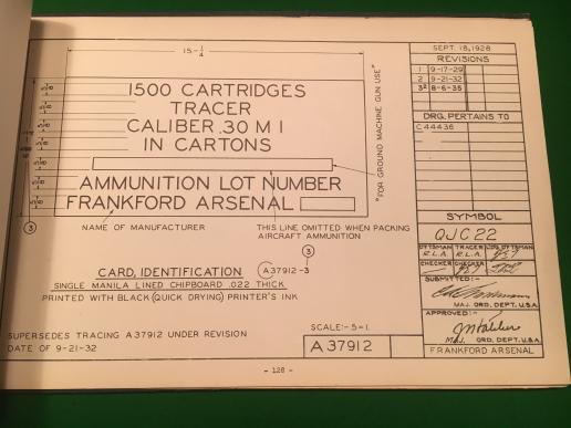 1939 Frankford Arsenal ' Description of Manufacture Cartridge, Tracer Cal..30M1 '. This through 136pg examination marked ' Restricted ' covers every aspect of manufacture from design to completed round with a large number of engineering drawings , diagrams and b/w photographs. In excellent, clean condition.