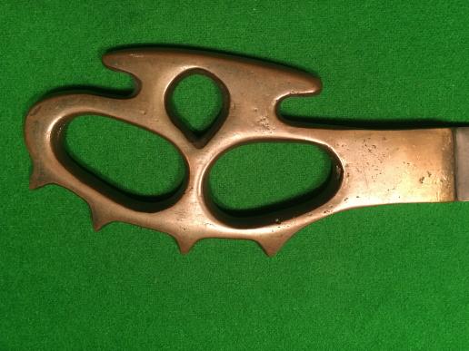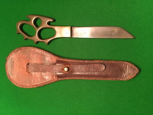 Brass and steel knuckle knife that is generally associated with the Middle East Commando and was the inspiration for the design of their cap badge. ' Death's head ', brass knuckle duster hilt with a 6 " single edged bowie-style blade contained in a sturdy leather sheath. Good, as found condition with patinated hilt and marked blade with slightly dusty scabbard. Indistinct initials ' R.A.? ' marked to reverse of scabbard. An excellent example.
