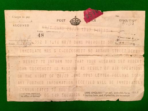 A poignant grouping of 39/45 Star, Aircrew Europe and War Medal to 1163110 Sgt.Robert John Cockshott aged 22 from Derby. Cockshott was part of the crew of StirlingIII BF483 OJ:C of 149 Sqn. that was reported missing on a mission to Cologne on 28/29/06/1943. The aircraft appears to have been shot down by Lt. Werner Hopf II./NJG5. North Sea, 25 km. W. Schowen 4.200 m. 02.47. None of the crew survived and are commemorated on the Runnymede Memorial. Accompanying the boxed medals, named condolence and packing slips is the poignant telegram to Cockshott's wife informing her of his missing status. Emotive grouping.