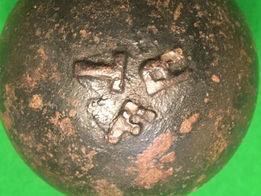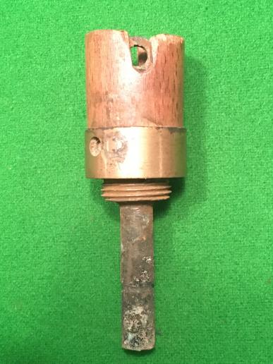 A good example of the French Mle.1914 Ball Grenade. Cast body, manufacturer marked to the bottom with screw in wood and brass friction igniter. In good condition with some minor pitting strippable.