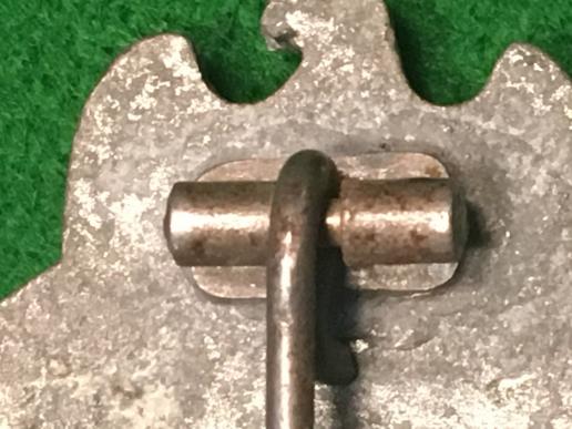 Panzer Assault badge by an unknown maker . Semi-hollow,scooped , zinc construction with wire ' C ' form catch and steel pin with a soldered, steel hinge. Residual bright silver finish to the obverse with wear to highlights. Good overall condition.