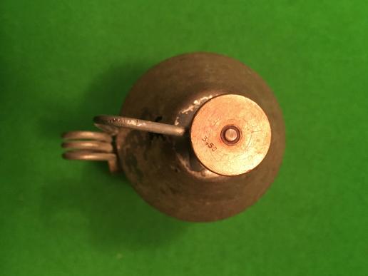 Danish manufactured where it was referred to as the "Haandbombe Model 1923." The practice grenade is heavy steel construction to simulate the live weight and can be identified by the small hole drilled into the body on the top cone. The end cap has a exhaust hole for the practice charge which would be inserted.