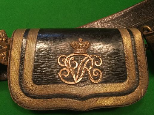 A good example of a Victorian Medical Officer's Full Dress Pouch and Strap. Black rectangular pouch with central crowned ' VR ' cypher surrounded by gilt wire edging and gilt acanthus leaf side mounts. Black leather shoulder strap with triple gilt wire lines and mounted with gilt acanthus leaf buckle, slider and mounts. Interior mounting loop. Good, used condition.