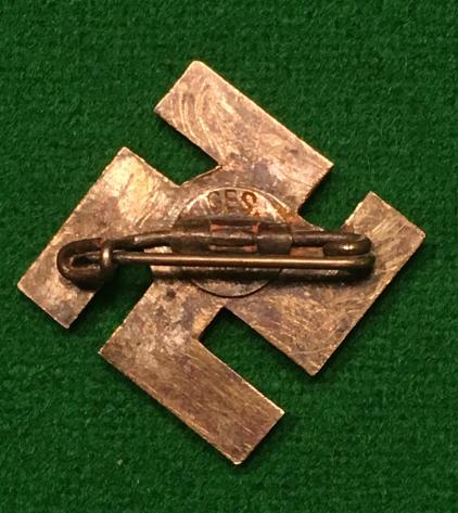 An uncommon and insignificant looking award called the Frontbann badge, often mistaken as a daybadge. The badge was instituted in 1932 and designated as an official award in 1933. The Frontbahn was set up in 1924 as a substitute for the then banned SA men. The award had a short life span as it was no longer authorized for wear after 1934. In good overall condition marked ' Ges Gesch ' to reverse fitting with vestigial remains of the silvered finish.