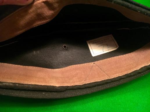 An excellent example of an officer's field service cap worn by an officer of the York & Lancaster Regiment. Fine melton cloth body with yellow peak, maroon crown and white piping. Cast, two piece gilt, silver and enamel York and Lancaster Regiment cap badge with gilt and silver regimental buttons. Unlined interior with a soft plush headband. Label indicating manufacture by Hobson & Sons of London and a size 7 1/8. Excellent condition through out with one barely visible moth nip to piping.