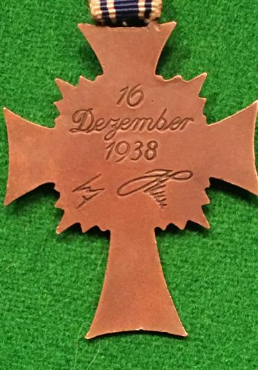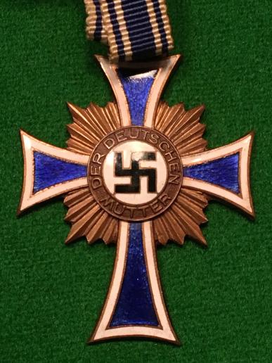 The Ehrenkreuz der Deutschen Mutter, the " Cross of Honour of the German Mother " was conferred between 1939 until 1945 in three grades: bronze, silver, and gold, to females who exhibited probity, exemplary motherhood, and who conceived and raised at least four or more children in the role of a parent. This example is of the lowest grade in bronze with a full length ribbon and in good overall condition.