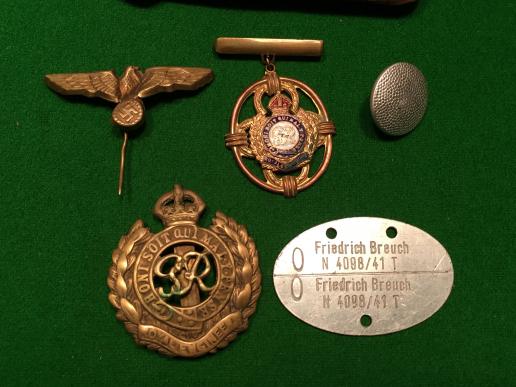 House clearance find, leather purse containing war souvenirs, RE cap badge and a similar sweetheart badge, Kriegsmarine identity tag, Kriegsmarine cap eagle, German uniform button alongside a queen of diamonds playing card. Evocative wartime grouping.