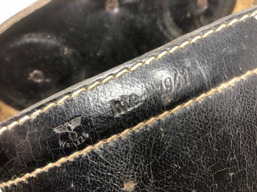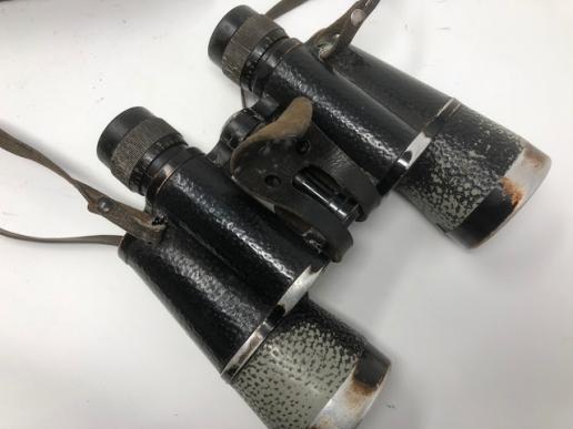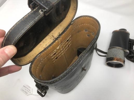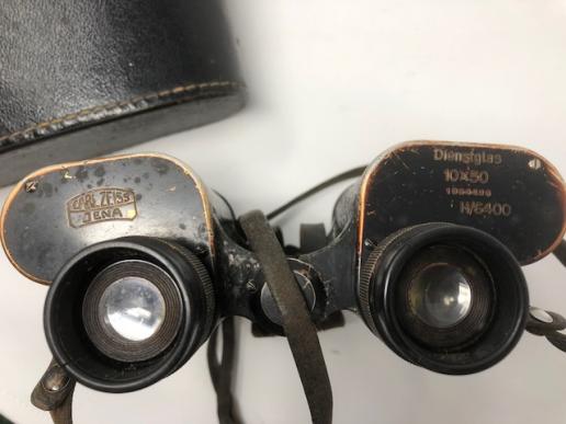 A great pair of Third Reich binoculars complete with the original hard case.This is Waffanampt marked with small eagle and swastika and dated 1941. Case is in near perfect condition and is complete with partial wide hanging strap with buckle. The binoculars have seen proper substantial use with the leather covering showing hand wear. Marked KARL ZEISS JENA on one lens and DIENSGLAS 10x50 with serial numbers etc underneath. The original leather neck strap is in place, as well as the original leather 'button hole' frog, used to attach to a uniform button. These were brought back as a souvenir by a sailor in the Royal Marines and turned up in my local antique clock shop! Unfortunately no details were taken of the family member. The binoculars work perfectly, need a proper clean and service. One lens is 100% clear, the other has some dust and 'foxing' but no cracks or chips. A specialist service, and you will have a fantastic set of high quality, historical binoculars.
