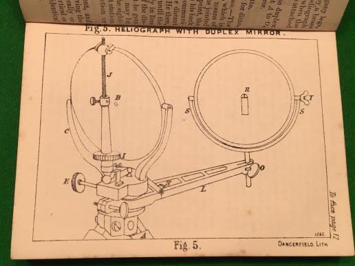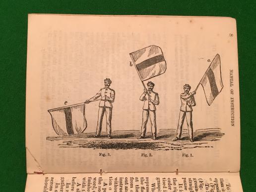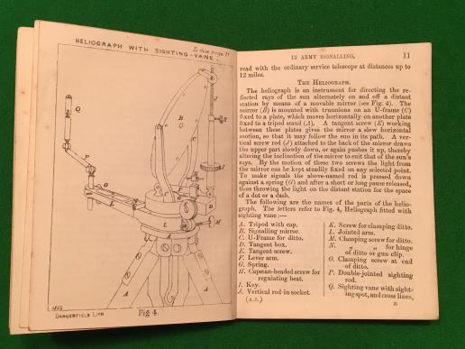 1888 ' Manual of Instruction in Army Signalling '. 88pgs with diagrams and illustrations explaining the use visual signalling with flags and heliograph as well as the use of morse and ciphers. Good, overall condition with some foxing and a small split to spine.