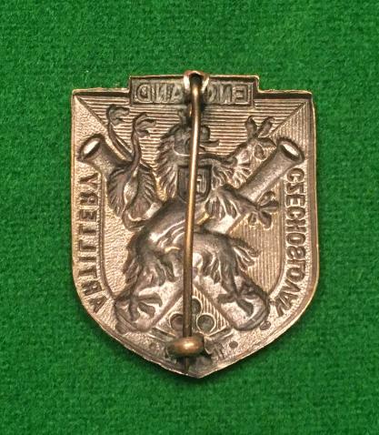 Silvered, die struck breast/lapel badge of the Czechoslovak Army Artillery in England 1940. Pin fitting to reverse, probably made by H.W.Miller Ltd B'ham. Good overall condition with wear to highlights.
