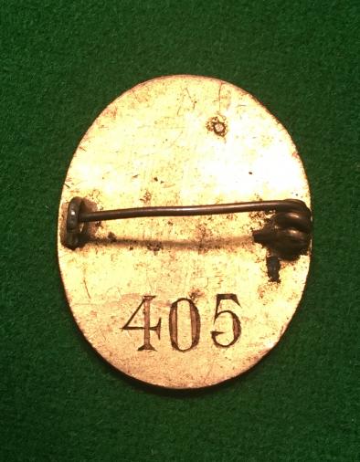 Gilt and enamel pinback badge indicating the wearer was on War Service with W.W.Greener the well known Birmingham gunsmiths. During WW1 Greeners undertook a number of weapons related contracts for the War Office including the manufacture of flare pistols. Unusually engraved to the reverse ' 405 ' showing that the gun engravers' art was still present. Good, used condition with some small enamel damage at the 7 o'clock position. Scarce.